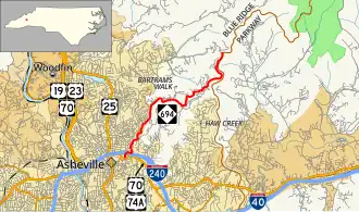 NC 694 is a 6.3-mile (10.1 km) two-lane scenic highway begins in downtown Asheville. Going northeast from its southern terminus at Martin Luther King Jr. Drive and College Street (the latter of which also carries U.S. Route 70 (US 70) and US 74A), it passes over Interstate 240 as it quickly ascends Beaucatcher Mountain, eventually to the ridge line. From there it curves along the east-side of Sunset Mountain and Patton Mountain, then on the south-side of Rich Knob and Meadows Mountain, before going around the southeast side of Peach Knob. It meets-up with the Blue Ridge Parkway at Craven Gap where it ends. The overall road is curvy, but manageable after the initial climb. There are no signage at the intersection with the Blue Ridge Parkway that indicates it as NC 694; visitors along the BRP will need to look for it at Craven Gap, near milepost 377 (607 km).[1]