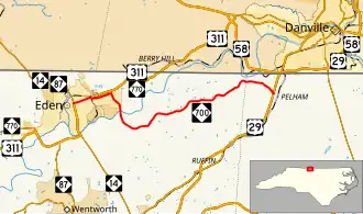 Rockingham | Eden | 0.0– 0.1 | 0.0– 0.16 | ![]() ![]() ![]() ![]() ![]() ![]() | Interchange; west end of NC 770 overlap |