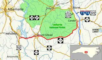 NC 731 is a two-lane rural highway that traverses 25.9 miles (41.7 km). Beginning at U.S. Route 52 (US 52) south of Norwood, it goes west crossing the Pee Dee River and through Mount Gilead. In Mount Gilead, NC 731 intersects NC 109 and NC 73 and has a concurrency with the unsigned NC 109 Business (NC 109 Bus.). Forming the southern boundary of the Uwharrie National Forest, it continues a northwesterly direction, linking up with US 220 Alternate (US 220 Alt.) as it enters Candor. At the center of Candor, NC 731 ends, connecting with NC 211 and US 220 Alt. continuing north to Biscoe.[1]