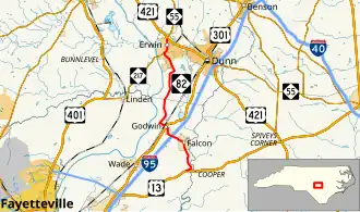 North Carolina Highway 82 (NC 82) is a primary state highway in the U.S. state of North Carolina. The highway traverses where the Battle of Averasborough took place and connects the towns of Erwin, Godwin and Falcon. Though the road is signed as east and west, it runs physically north from Erwin to US 13 to the south near Cooper.