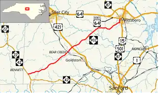 Between 1958-63, NC 902 was truncated, just south of Bennett, at NC 22/NC 42; the old alignment became part of NC 42.[6][7] In 1964, NC 902 was extended east to its current eastern terminus at US 64 (now US 64 Bus.) and NC 87 in Pittsboro.[8][9] In 2000, NC 87 was rerouted onto 0.8 miles (1.3 km) of NC 902 in Pittsboro.[10][11]