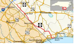 NC 904 is a 67.5-mile (108.6 km) east–west highway (physically running northwest–southeast) that travels from NC 130 in Five Forks, to East First Street in Ocean Isle Beach. It passes through Brunswick, Columbus, and Robeson Counties.[1]