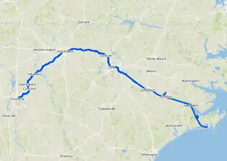 The North Carolina Railroad (reporting mark NCRR) is a 317-mile (510 km) state-owned rail corridor extending from Morehead City, North Carolina, to Charlotte. The railroad carries over 70 freight trains operated by the Norfolk Southern Railway and eight passenger trains (Amtrak's Carolinian and Piedmont) daily. The railroad works with the North Carolina Department of Commerce and the North Carolina Department of Transportation on capital-improvement projects.