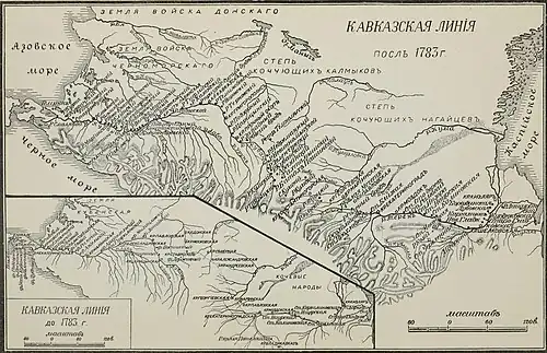 The North Caucasus Line (Russian: Кавказская линия) was a line of Russian forts and Cossack settlements along the north side of the Caucasus Mountains. Originating in the mid-16th century with a small number of free Cossacks near the Caspian Sea, from the mid-18th century the line was pushed west and used as a base to conquer the mountains to the south and to settle the steppes to the north.