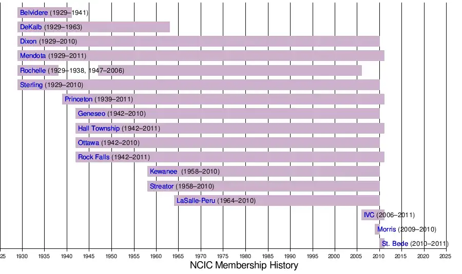 Until the departure of the Rochelle Hubs in 2006, the NCIC's 42-year span of unchanged membership was the longest of any high school conference.[1] However, that one change sent shockwaves through the rest of the conference, ultimately resulting in the dissolution of the NCIC at the end of the 2010–11 school year.