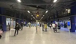 The striking blue-tiled and glazed interior, with raking concrete columns rearing up inside the huge underground space, was designed by the architects practice Alsop, Lyall and Störmer.[21][11] The blue tiles on walls were inspired by the design of MTR stations in Hong Kong, where every station adopts a livery in order to help passengers to recognise their alighting stop.[22] As with other stations on the Jubilee Line Extension, all platforms are equipped with platform screen doors.