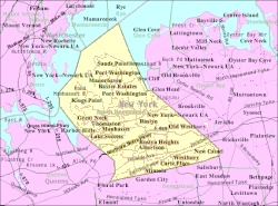 North Hempstead is the only town on Long Island that does not have a corresponding hamlet or village in its borders with the same name; Hempstead and Oyster Bay in Nassau County and the towns of Huntington, Babylon, Islip, Smithtown, Brookhaven, Riverhead, Southold, Southampton, Shelter Island and East Hampton in Suffolk County all have smaller neighborhoods with the same name.[7]