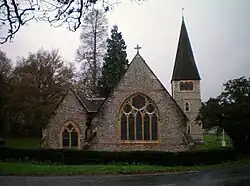A parish of Holmwood was created from parts of Dorking and Capel parishes in 1839.[3] The parish church was built of flint in Early English style and consecrated in 1875.[4] The tower contains two bells and a clock. The east window of the chancel has stained glass from 1874 made by Messrs Powell of White Friars. The west windows of the chancel have glass designed by Charles Eamer Kempe from 1891 showing the four Fathers of the Western Church.[3][5]