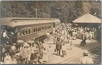 The NSR was operated by John Martin and Eugene de Sabla Jr., pioneers in the electric railroad business. The southern 23 miles (37 km) of line were modernized to allow operation of standard-gauge electric passenger cars in addition to narrow-gauge steam-powered freight trains. Electric cars sometimes shared dual-gauge tracks with the steam trains, while at other locations a separate track for the electric cars was constructed parallel to the narrow-gauge route. The line was ultimately double tracked from Sausalito to San Anselmo except for the Alto tunnel. A power house was built at Alto and power was also purchased at San Rafael. Direct current electrical power was transmitted to the trains at 600 volts by a third rail (which was actually a fourth rail on the dual-gauge segments.)[5] Service started to Mill Valley on August 20, 1903, and to San Rafael on October 17, 1903. It was the first United States steam railroad electrified for operational efficiency rather than for smoke abatement. The railroad established practices later used in Grand Central Terminal and the interborough subways of New York City.[6] The electric lines were expanded after 1907 as part of the Northwestern Pacific Railroad. Interurban services ceased on February 28, 1941.[7]