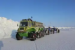 On 1 March 2013 the Russian Marine Live-Ice Automobile Expedition (MLAE 2013) with Vasily Elagin as a leader, and a team of Afanasy Makovnev, Vladimir Obikhod, Alexey Shkrabkin, Andrey Vankov, Sergey Isayev and Nikolay Kozlov on two custom-built 6 x 6 low-pressure-tire ATVs—Yemelya-3 and Yemelya-4—started from Golomyanny Island (the Severnaya Zemlya Archipelago) to the North Pole across drifting ice of the Arctic Ocean. The vehicles reached the Pole on 6 April and then continued to the Canadian coast. The coast was reached on 30 April 2013 (83°08N, 075°59W Ward Hunt Island), and on 5 May 2013 the expedition finished in Resolute Bay, NU. The way between the Russian borderland (Machtovyi Island of the Severnaya Zemlya Archipelago, 80°15N, 097°27E) and the Canadian coast (Ward Hunt Island, 83°08N, 075°59W) took 55 days; it was ~2300 km across drifting ice and about 4000 km in total. The expedition was totally self-dependent and used no external supplies. The expedition was supported by the Russian Geographical Society.[57]