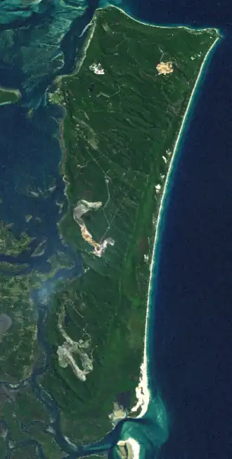 At 275.2 square kilometres (106.3 sq mi; 68,000 acres), it is the second largest sand island in the world.[8] On the island there are three small towns, a number of lakes and beaches along most of the seaward coastline with rocky outcrops at Point Lookout. An Aboriginal presence on the island has been long and ongoing, resulting in a successful native title determination. Tourism is a major and growing industry on the island.[9] The island has been the site for sand mining for more than sixty years. Tourism and currently mining are the island's main industries.