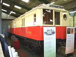 No. 3267 is the sole surviving example of the stock built-in 1904 for the Tyneside Electrics system, the first suburban electric railway in the country. The system used third rail power and trains formed into multiple units. The vehicle was one of two on the system fitted out as vans, with driving cabs at each end. They were used to carry fish and sundry goods, as well as acting as the locomotives for passenger services on the Riverside branch. After withdrawal in 1938, the two vans had their motors removed and were converted to de-icing vans, hauled along the system at night by steam locomotives. It has since been restored to NER livery, and is on static display in the museum, on loan from the National Rail Museum.[31][35]