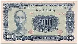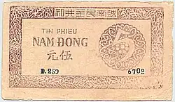- ^ Chữ Hán appeared on North Vietnamese banknotes that were issued until 1953. The term nguyên (元) was used for the Hán inscriptions, while đồng (銅) was used in Latin script as the name for the currency. Also note that in Chinese languages the đồng is called the "北越盾" (Bắc Việt thuẫn, "Northern Việt shield"), because of the similarity in pronunciation between the Vietnamese "銅" and Chinese "盾".