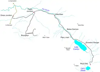 The North Wales Narrow Gauge Railways (NWNGR) was a railway company that planned to build a number of inter-connected 1 ft 11+1⁄2 in (597 mm) narrow-gauge railways across North Wales. The first two of these lines – jointly known as the "Moel Tryfan Undertaking" – were authorised by act of Parliament, the North Wales Narrow Gauge Railways Act 1872 (35 & 36 Vict. c. clxxv) and were built and opened in the 1870s. The original main line ran from Dinas Junction to Bryngwyn and opened in 1877. The second line was a branch from Tryfan Junction to South Snowdon, though shortly after opening, the company designated the Tryfan Junction to Bryngwyn section as the branch, and the Dinas Junction to South Snowdon section as the main line.