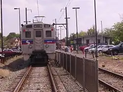 North Wales station is a station along the SEPTA Lansdale/Doylestown Line located at Beaver and School Streets in North Wales, Pennsylvania. In FY 2017, North Wales station had a weekday average of 974 boardings and 855 alightings.[4] The station includes a 167-space parking lot. Parking is available on both sides of the tracks between Beaver Street and Walnut Street, which includes an entrance at Walnut and 5th Streets. The east parking lot runs between the tracks and 6th Street/Railroad Street. School Street runs through the west parking lot, and then turns southwest while that parking lot continues to follow the tracks, almost reaching Walnut Street.