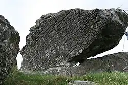 The Moine Thrust Belt was formed between 430 and 500 million years ago. The belt includes Precambrian Moine rocks which have been pushed on top of younger Cambrian and Ordovician rocks, much to the surprise of Victorian geologists.[6][7] A debate ensued between prominent geologists of the time. Roderick Murchison and Archibald Geikie argued that the Moine rocks must in fact be younger than the rocks beneath them, a point of view opposed by James Nicol and Charles Lapworth. The controversy, the so-called "Highlands Controversy", was resolved by Ben Peach and John Horne who found that the Moine rocks had been pushed some 70 kilometres east over the top of the younger rocks by tectonic action. This was the first thrust fault to be discovered.[8] A monument to the pair is located within the park. Its inscription reads: To Ben N Peach and John Horne who played the foremost part in unravelling the geological structure of the North West Highlands 1883–1897. An international tribute. Erected 1930.[9] The fault can be seen most easily at a line of cliffs named Knockan Crag. This crag is where the Moine is where the apparent anomaly in the ages of the rocks was first seen, and is where the thrust belt was first identified. A visitor's centre is located here, as well as several pieces of sculpture created by modern artists.[10]