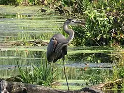 A myriad of species reside there year-round, though a large part migrates southwards in the autumn, only to return in the spring. The presence of the watercourse means that many aquatic species thrive there; among these, some of the most impressive and common are the great blue heron, the double-crested cormorant, and the Canada goose. Water often means insects will gather in large amounts, many birds live by the waterside for its abundance of food.