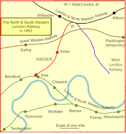 Turning up the heat even further, the N&SWJR flirted with the idea of an extension to Richmond, and this gained considerable support but failed in Parliament. Feeling itself under pressure, the LSWR arranged with the N&SWJR to run a Twickenham - Richmond - Hampstead Road service, reversing at Barnes and again at Kew; some LSWR coaches apparently worked through to Fenchurch Street. The service started on 20 May 1858.