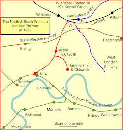The proximity of the unconnected LNWR and LSWR railways immediately west of London led to a number of failed schemes, until in 1851 the North and South Western Junction Railway (N&SWJR) obtained its authorising act of Parliament, the North and South Western Junction Railway Act 1851 (14 & 15 Vict. c. c) for a 4½ mile line[note 1] from Willesden (N&SW Junction, near West London Junction), to Brentford (actually Kew Junction, later renamed Old Kew Junction).[1][2]