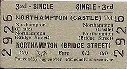 Closures accelerated under British Railways with the withdrawal of services from Bridge Street station, which lost much if not all of its significance following the opening of the Loop,[25] on 4 May 1964[9][35] when the Northampton to Peterborough line was closed, leaving only Castle station serving the town.[27] As a result, Castle station was renamed Northampton on 18 April 1966.[9][37] In addition, the bay platforms 4 and 5 were removed and the area converted into an overflow car park.[38] The Great Northern and London and North Western Joint Line closed to all passenger traffic except for a workmen's service on 7 December 1953; the workmen's service between Market Harborough and East Norton ended on 20 May 1957.[39] The section between Welham Junction and Marefield North Junction closed in November 1963, followed by the Rugby and Stamford Railway on 6 June 1966.[39] The line to Market Harborough closed on 15 August 1981.[40]