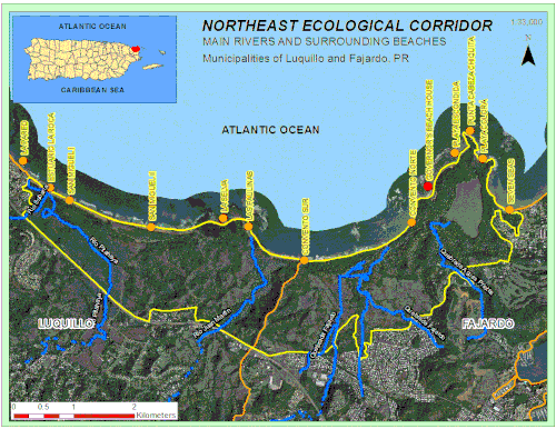 The Northeast Ecological Corridor Nature Reserve (NECNR) (Spanish: Reserva Natural Corredor Ecológico del Noreste) refers to an area designated as a protected Nature Reserve located on the northeast coast of Puerto Rico, between the municipalities of Luquillo and Fajardo. Specifically, the lands that comprise the NEC are located between Luquillo's town square to the west and Seven Seas Beach to the east, being delineated by PR Route # 3 to its south and the Atlantic Ocean to its north. It was decreed as a protected area by former Puerto Rico Governor Aníbal S. Acevedo-Vilá in April 2008, a decision reversed by Governor Luis G. Fortuño-Burset in October 2009, although he later passed a law in June 2012 re-designated as nature reserve two-thirds of its lands, after intense lobbying and public pressure. Later, in 2013, Governor Alejandro García-Padilla signed a law declaring all lands within the NEC a nature reserve. The area comprises 2,969.64 acres (1201.77 hectares),[1] which include such diverse habitats as forest, wetlands, beaches, coral communities, and a sporadically bioluminescent lagoon. The Corridor is also home to 866 species of flora and fauna, of which 54 are considered critical elements, meaning rare, threatened, endangered and endemic species classified by the Puerto Rico Department of Natural and Environmental Resources (DNER), some even designated as critically endangered by the International Union for Conservation of Nature and Natural Resources (IUCN). These include, among others, federally endangered species such as the plain pigeon, the snowy plover, the Puerto Rican boa, the hawksbill sea turtle and the West Indian manatee. The beaches along the NEC, which are 8.74 kilometers (5.43 miles) long are important nesting grounds for the leatherback sea turtle (Dermochelys coriacea), which starts its nesting season around April each year.