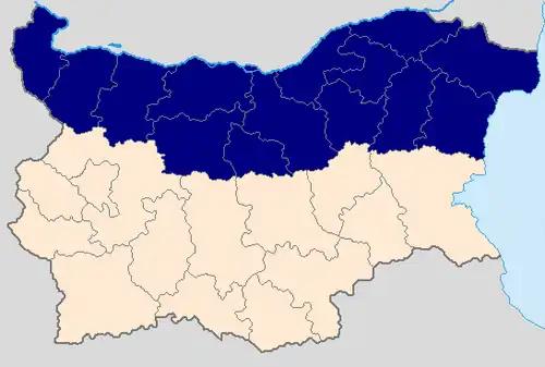 Northern Bulgaria (Bulgarian: Северна България, romanized: Severna Bylgarija), also called Moesia (Bulgarian: Мизия, Mizija) is the northern half of Bulgaria, located to the north of the main ridge of the Balkan Mountains which conventionally separates the country into a northern and a southern part. Besides the Balkan Mountains, Northern Bulgaria borders the Timok River and Serbia to the west, the Danube River and Romania to the north, and the Bulgarian Black Sea Coast to the east.