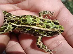 Lithobates pipiens[1][3][4][5] formerly Rana pipiens,[6][7] commonly known as the northern leopard frog, is a species of leopard frog from the true frog family, native to parts of Canada and the United States. It is the state amphibian of Minnesota and Vermont.