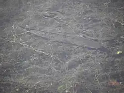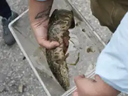 The fish first appeared in U.S. news when an alert fisherman discovered one in a Crofton, Maryland, pond in the summer of 2002.[16] The northern snakehead was considered a threat to the Chesapeake Bay watershed, and wary officials took action by draining the pond in an attempt to destroy the species. The action was successful, and two adults and over 100 juvenile fish were found and destroyed. A man admitted having released two adults, which he had purchased from a New York City market, into the pond.[17]