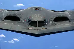 The Northrop B-2 Spirit is an American heavy strategic bomber that uses low-observable stealth technology to penetrate sophisticated anti-aircraft defenses. It is often referred to as a stealth bomber.[3][A]
