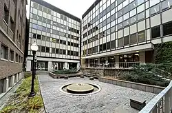 A critically acclaimed example of modern architecture, built as part of a renovation linking Vincent and Murphy Halls together, and located between the two buildings. The design, created by landscape architect Roger Martin with support from University Architect, Winston Close, and Head of the university's School of Architecture, Ralph Rapson, replaced an earlier concept by the architecture-engineering firm Toltz, King & Day, who were in charge of building the connections between the two buildings, that was considered to be less sophisticated. No evidence exists about the condition and usage of the space prior to its construction. The courtyard's furnishings, circulation, and recessed design is meant to invoke a sense of peacefulness, unique from the rest of the campus. A 15-foot diameter dome-shaped fountain made of concrete is set in the middle of the space with a jet of water flowing from the top and down the sides; the initial jet reaching a height of three feet and eight inches, and meant to be visible when entering.[66]