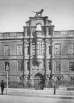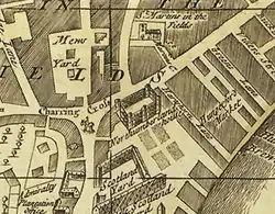 In 1608–09, Henry Howard, 1st Earl of Northampton built a house on the eastern side of the former Chapel and Hospital of St. Mary Rounceval, at Charing Cross, including gardens running to the River Thames and adjoining Scotland Yard to the west.[5] The estate became the property of Algernon Percy, 10th Earl of Northumberland when he married Howard's great-great niece, Lady Elizabeth, in 1642, whereupon it was known as Northumberland House. In turn, the street was named Northumberland Street.[5] The house was damaged in the Wilkes' election riots of 1768, but was saved after its owner, Hugh Percy, 1st Duke of Northumberland opened the nearby Ship Ale House, driving off rioters.[5]