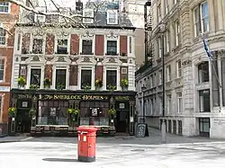 Northumberland Avenue is referenced several times in Arthur Conan Doyle's Sherlock Holmes novels, including The Greek Interpreter and The Hound of the Baskervilles. The stories refer to wealthy Oriental visitors staying in hotels along the avenue, including the Grand, the Metropole and the Victoria.[31] The Northumberland Arms, at the junction of Northumberland Street and Northumberland Avenue, a public house, was renamed the Sherlock Holmes in 1957, and contains numerous Holmes-related exhibits from the 1951 Festival of London.[32]