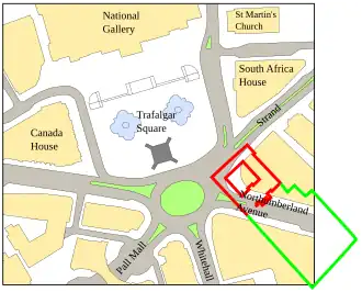 By the end of the mid-19th century the other mansions on the Strand had been demolished. The area was largely commercial and its entertainment industry had grown, meaning it was no longer a fashionable place for aristocracy to live. The then Duke of Northumberland was reluctant to leave his generations-held home, although he was pressured to do so by the Metropolitan Board of Works, which wished to build a road through the middle of the site to connect to the new roads by the Embankment. After a fire which caused substantial damage, the Duke accepted an offer of £500,000 in 1874 (equivalent to £58,600,000 in 2023). Northumberland House was demolished and Northumberland Avenue, including its buildings fronting, was built in its place.[11]