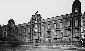 The balustrade of the Strand front carried an inscription in stone letters.[5] During the funeral of Anne of Denmark in May 1619, a large stone letter 'S' fell from the façade onto spectators of the procession, killing one William Appleyard.[6] According to Nathaniel Brent, the stone was part of a motto and was "thrust down by a gentlewoman who put her foot against it, not thinking it had been so brickle [brittle]".[7]