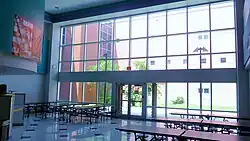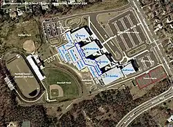 The school has six tennis courts located just outside the auditorium to the east of the building and it has several basketball courts located at the rear of the building outside the food court, which have been decommissioned and now serves as an area which houses several of the school's portable classrooms. There are three athletic fields in the rear of the building: the football/soccer stadium, which also encompasses the running track which surrounds the football/soccer field; a softball field, and a baseball field.[3]
