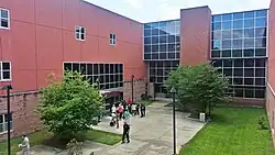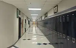 Northwestern is divided into four distinct "sub-schools": the A-Wing, B/G-Wing, C-Wing, and D/E/F-Wing.[3] Each can house between 600 and 700 students. The original plan was to physically divide the school into four smaller schools, hence the design theme of the building.[20] Sub-School A was intended to be the "School of Fine, Creative, and Performing Arts"; Sub-School B was to be the "School of Career and Consumer Education"; Sub-School C was to be a general facility that housed mainly elective courses, in addition the school's main offices, security office, and health center; and Sub-School D was to be "The School of Intensive and Specialized Instruction," which would house the school's honors and advanced placement program as well as the school's ESOL (English Speakers of Other Languages) program and Vocational Development (Special Education) program.[20] Students were not to be permitted to interact with students from other sub-schools, and were to be isolated within their sub-school for the majority of the school day.[20] Due to scheduling conflicts and feasibility issues with this concept, the idea was dropped before the new building ever opened, while the idea of smaller learning communities was retained and revised to become less restrictive and isolating.