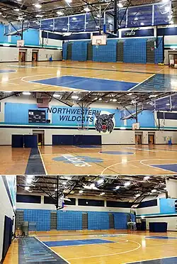 Northwestern's campus features three courtyards[3] between the four wings of the building. The school has a total of five parking lots: the large main parking lot (located in front of the facility, where the former facility once stood) designated for staff and visitors; an adjacent lot located in front of the auditorium, reserved for staff and students; two smaller lots at the rear of the facility, reserved for staff or visitors attending athletic events; and a large bus bay capable of accommodating 44 school buses, located in front of the facility, which doubles as another lot for staff and visitors, during and after the regular school day.