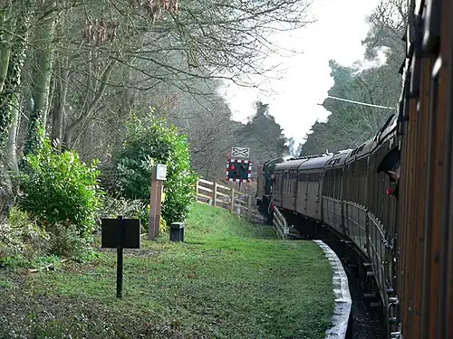Northwood Halt is an unstaffed request stop on the Severn Valley Railway in Worcestershire, situated a little to the north of Bewdley on the outskirts of the Wyre Forest at the north end of North Wood. There is an ungated level crossing just to the south of the single platform.