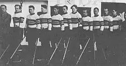 The Norwegian Ice Hockey Association (NIHA) was founded in 1934 and, adopting the international rules and regulations of ice hockey, became a member of the International Ice Hockey Federation in 1935.[2][3] Poor finances delayed the formation of a national team until 1937, and continued to hamper its development in the years prior to World War II. After missing out on the 1935 World Championships and 1936 Winter Olympics, the NIHF managed to raise enough funds to send a team to London for the 1937 World Championships. The national ice hockey team thus played its first game on 17 February 1937, losing 0–7 to Czechoslovakia, and was eliminated from the competition following a 2–13 loss to Switzerland.[4] Norway also took part in the next tournament in 1938, but was unable to participate in 1939. Results remained meagre throughout the pre-war years; of the nine international fixtures contested between 1937 and 1940, the closest Norway came to winning was 3–4 in the first game against Sweden, on 20 January 1939.[5]