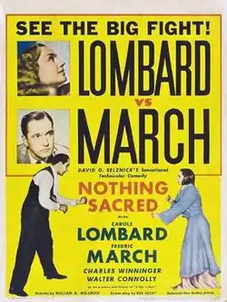 Nothing Sacred is a 1937 American Technicolor screwball comedy film directed by William A. Wellman, produced by David O. Selznick, and starring Carole Lombard and Fredric March with a supporting cast featuring Charles Winninger and Walter Connolly. Ben Hecht was credited with the screenplay based on the 1937 story "Letter to the Editor" by James H. Street, and an array of additional writers, including Ring Lardner Jr., Budd Schulberg, Dorothy Parker, Sidney Howard, Moss Hart, George S. Kaufman and Robert Carson made uncredited contributions.