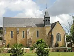 Pringé's Romanesque church features a single nave covered by a roof frame, a choir adorned with blind arctures topped by geminated bays, and a cul-de-four apse.[4] It is built of limestone on a Latin cross plan, with a slate roof. The portal, with its voussoirs resting on ornate but well-worn capitals, is located on the west gable.[5] To the north, the church retains the remains of a former cemetery, of which a few 18th-century tombs remain, while to the south is the former presbytery, in the form of a turreted dwelling.[5]