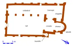 The floor plan of the church consists of a nave (17.50 × 9.40 m) open to the west and leading to a narrower transept crossing to the east, with its median axis more to the south. This crossing continues into a single-bay, trapezoidal choir ending in a semicircular apse.[6] Some remains of the original bell tower remain above this crossing. The transept extends only to the north of the crossing, and is prolonged to the east by a chapel. To the south, a turret containing a Saint-Gilles spiral staircase provides access to the attic. A side aisle widens the nave to the north; its northern gutter wall is extended by those of the transept and the chapel.