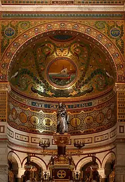 Following the death of Espérandieu on September 11, 1874, Henri Révoil was charged with finishing the interior of the basilica, in particular the mosaics. The construction of the major crypt and installation of the mosaics in the choir was carried out in 1882. Unfortunately a fire on June 5, 1884, destroyed the altar and the mosaic in the choir; moreover the statue of the Virgin was damaged. The statue and the mosaics were restored and the altar was rebuilt according to the drawings of Révoil. On April 26, 1886, cardinal Charles Lavigerie consecrated the new crypt.[59] In 1886, walnut stalls were built in the choir; the last mosaics in the side vaults were finished between 1887 and 1892. In 1897, the two bronze doors of the upper church and the mosaic above them were installed and the statue of the Virgin was regilded for the first time. Final completion of the basilica thus took place more than forty years after the first stone was laid.