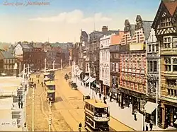 The Nottingham Corporation Act 1902 gave powers for the Forest Road line and for a number of short lengths of tramway, principally in the Market Place, to link up constructed or authorised tramways. It also gave powers for the corporation to operate motor omnibuses in connection with any tramway either during a period when it was impracticable to operate tramcars or as extensions. The layout in the Market Place caused much argument, and one suggestion was for a gyratory system, single line, that every car would have to negotiate when passing through the Market Place.[1]