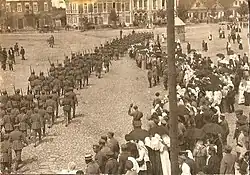 During the First World War, the city was under German occupation from 22 September 1915 to 27 December 1918.[24] On 22 September 1915, Novogrudok was occupied by the German 10th Army. The Russian-German front was now only 20 km East of the city, along the Servechi river. The Germans built a power plant, a network of narrow-gauge railways, and telephone lines. The creation of polish and belarusian schools was also allowed in the city.