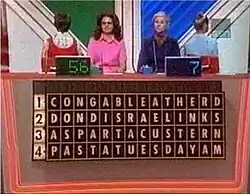 The members of the winning team competed against each other in the Semi-Finals, facing a board with four rows of 16 blanks each.[1] Narz read a crossword-style clue, after which the letters of the answer were filled in one at a time as he said "letter," starting at the far left end of the top row. Either contestant could buzz-in at any time, a correct answer scored one point and completed the word, but a miss gave the opponent a free guess before Narz resumed filling in the letters. If the word was not solved before its last letter was revealed, neither contestant scored. Each word after the first overlapped its predecessor by at least one letter, when the row became too full to accommodate any more words, play continued with a new word on the next row down.