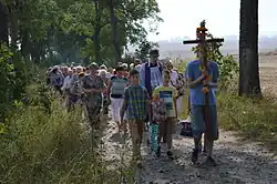The tradition of pilgrimages to the Shrine of Virgin Mary of Częstochowa began with the Reverend Józef Leonowicz, who first consecrated the shrine and then organized a church fair and pilgrimage. Although no more than 7 families lived in Nowa Wieś Reszelska, the news about the pilgrimage spread across the whole area. With each coming year, more and more people from neighbouring villages participated in the mass and the fair. At one time over 100 people participated in the event. Pilgrimages to nearby sites (in the Warmia dialect called łosiera) usually take place near large religious centres like the marine sanctuary in Święta Lipka.[10] Pilgrimages to such a small shrine like the one in Nowa Wieś Reszelska are very rare.[11]