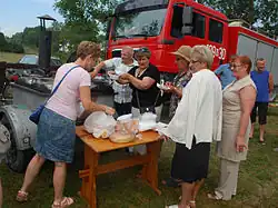 The Mass on the Virgin Mary of Częstochowa Day coincides with the local harvest festival and a variety of flower and plant adornments decorate the shrine and the altar. During the Mass a harvest festival bread is placed on the altar, where it remains until the mass' end. Afterwards the village leader shares it with the pilgrims.[14] Pots with flowers and ears of wheat and rye as well as wicker baskets filled with vegetables stand next to the altar. They symbolize the year's harvest. The shrine's entrance is festooned with garlands as well.[3]