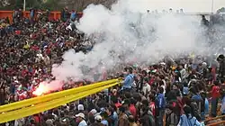 In the first leg of the finals against Universidad de Chile, O'Higgins beat "La U" at home 2–1 with goals of Rojas and the Argentine full back Alejandro López in a match known as La tarde de los paraguas felices because the rainy and cloudy day of the match in Rancagua.[27] In the second leg on 2 July, played at the Estadio Nacional, the scoreline was 1–1 which put O'Higgins up 3–2 on aggregate, and was about to win their first league title by becoming Torneo de Apertura champions, until the 92nd minute, because with Guillermo Marino's goal the series was equalized at 3–3 and the match went to penalties. "La U" won the penalty shootout 2–0 thanks to their keeper Jhonny Herrera, who saved three penalties.[28] However, the match was full of controversy, because the referee Enrique Osses conceded a non–existent penalty to Marino, that was scored by Aránguiz, and unfairly red-carded centre back Julio Barroso, after Universidad de Chile defender José Rojas had initially taunted Barroso.[29]