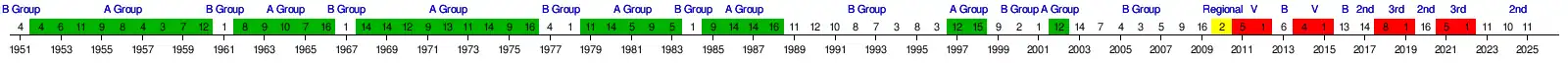 Green marks a season followed by promotion, red a season followed by relegation. |